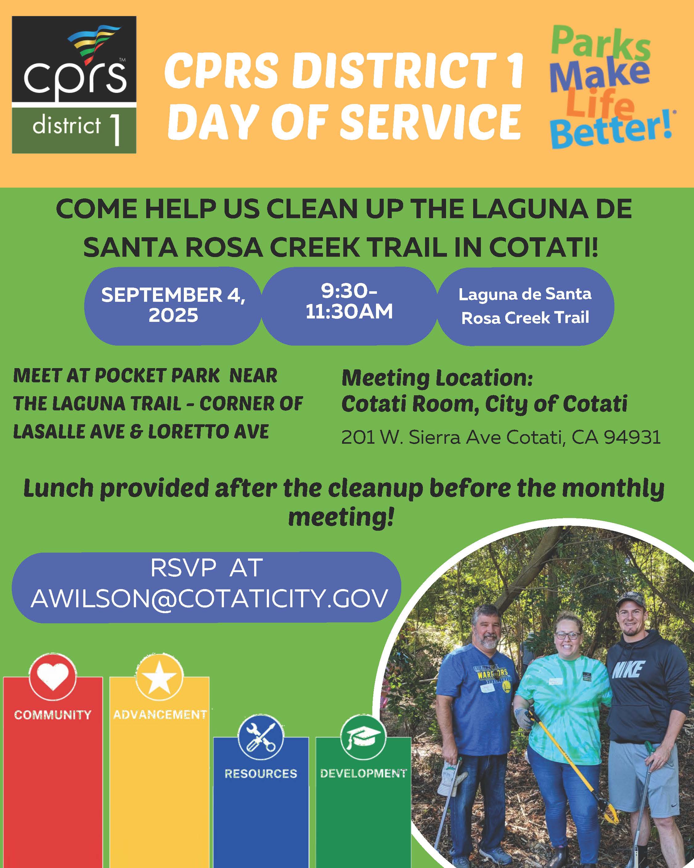 CPRS District 1 is partnering with the City of Cotati by working together to clean up the Laguna De Santa Rosa Creek Trail. Come join in on the fun as we clean up the trail before the winter months. This is a great way to network with colleagues, while pouring love into one of Cotati's recreation areas. All supplies will be provided.