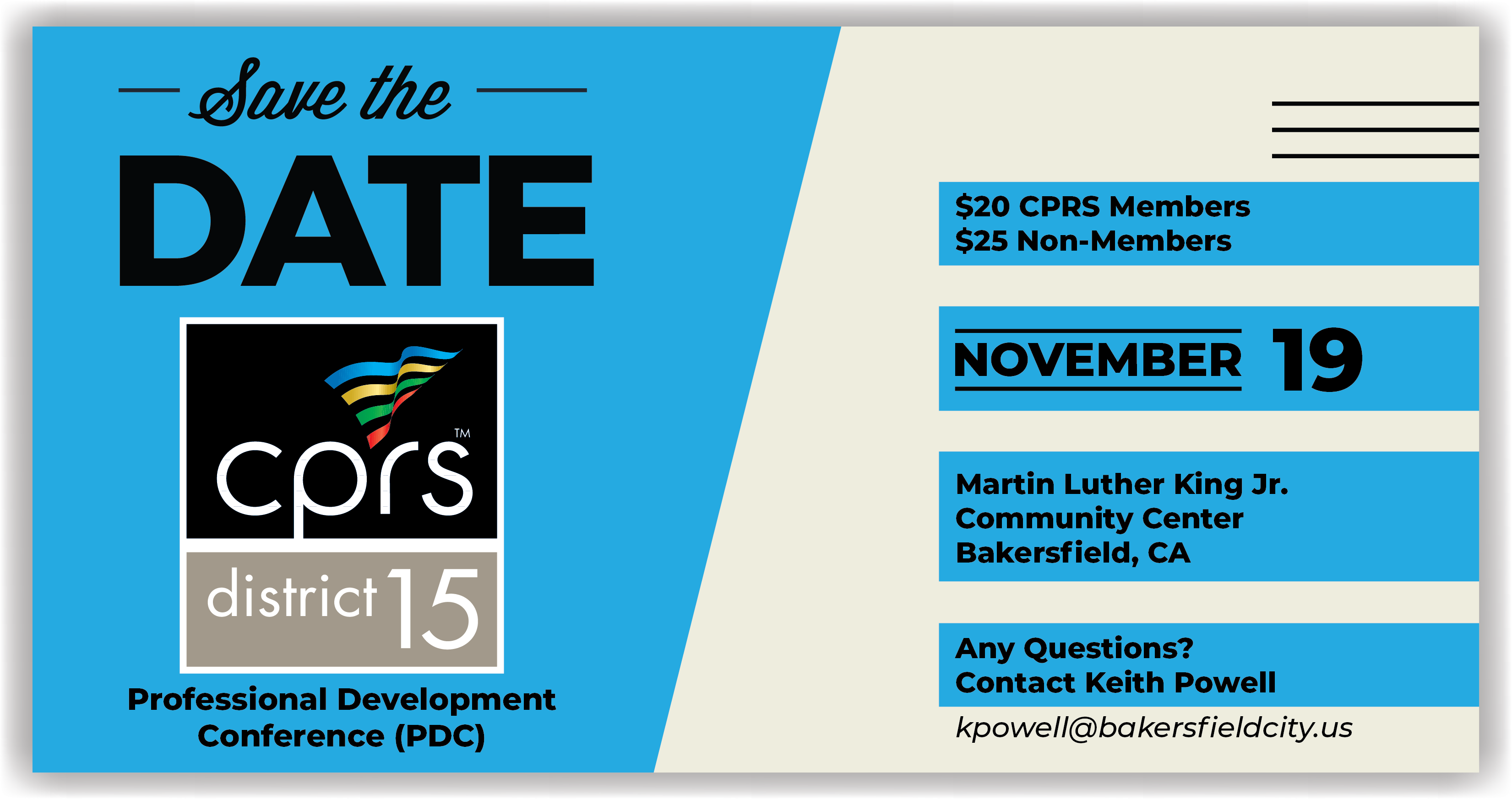 D15 is excited to host its annual Professional Development Conference on Wednesday, November 19 at the Martin Luther King Jr. Community Center in Bakersfield, CA! The conference will feature a variety of educational sessions, including topics such as CalPERS retirement, financial literacy, leadership, park maintenance, and more. Additional details will be shared soon!